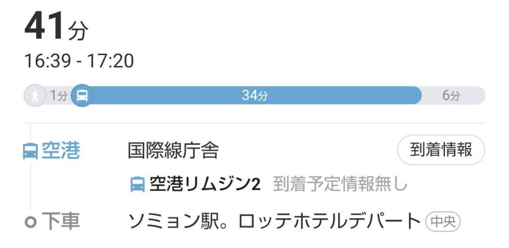 | リムジンバス | 6,000₩ | 約40分 | 楽 | 運行本数が少ない | ロッテホテル前に停車 |