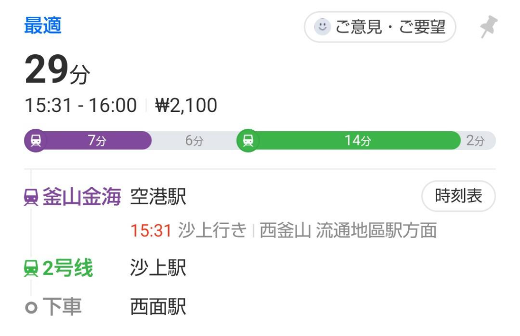 というわけで、釜山空港駅から西面駅までの平均所要時間は地下鉄の待ち時間も考慮して40分くらいをみておくと良いと思います。