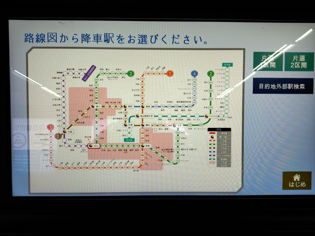 シンボルカラーは地下鉄2号線が「緑」、軽電鉄は「紫」なのでこれを覚えておけば迷うことは無いでしょう。
