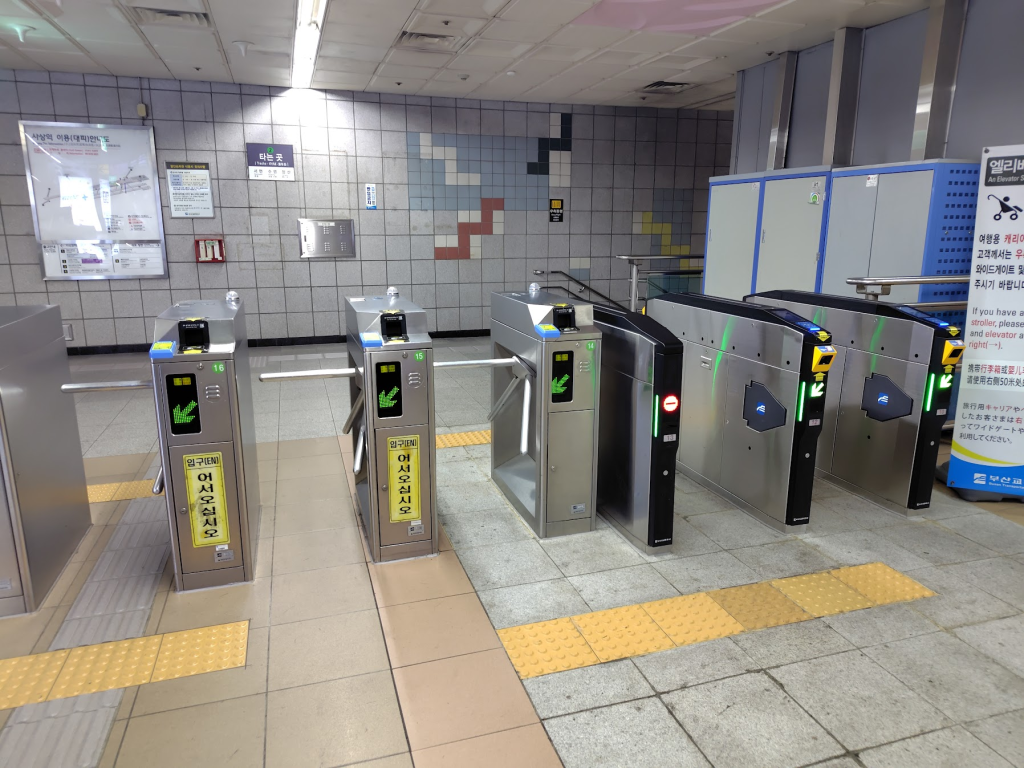釜山の地下鉄はこのようなグルグルバーの改札がまだ残っていますので、キャリーを引いて通ろうとすると引っかかってしまいます…笑