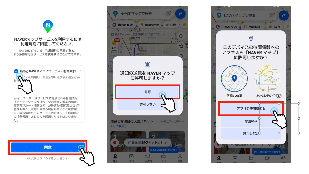 NAVERマップのアプリをインストーしたら『利用規約の同意』、『通知の送信の許可』、『位置情報アクセスへの許可』のたった3つのアクションをするだけです。