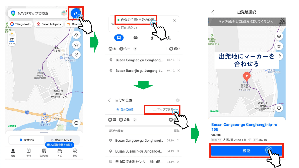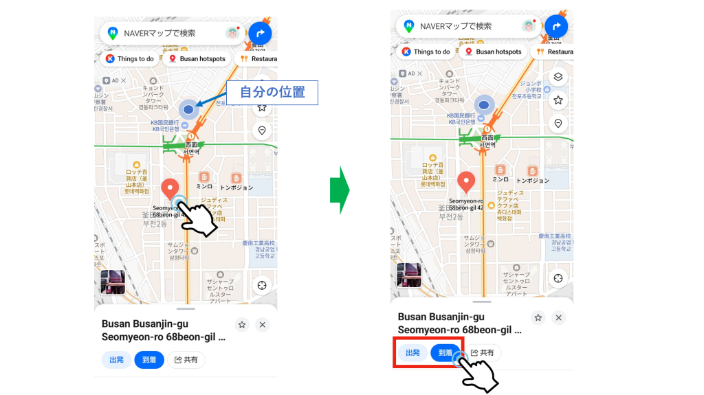 NAVERマップの基本的な仕組みは出発地と目的地の『位置情報を入力』することです。