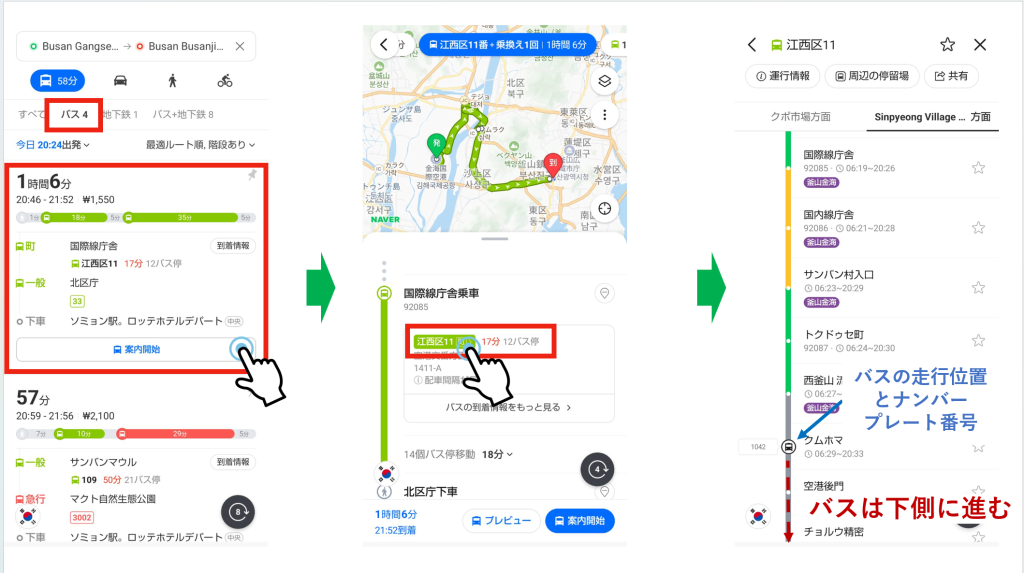 釜山(韓国)のバスは〇分間隔で運行という大雑把なスケジュールで走行しているので、バスの位置情報はとても重宝する機能です。