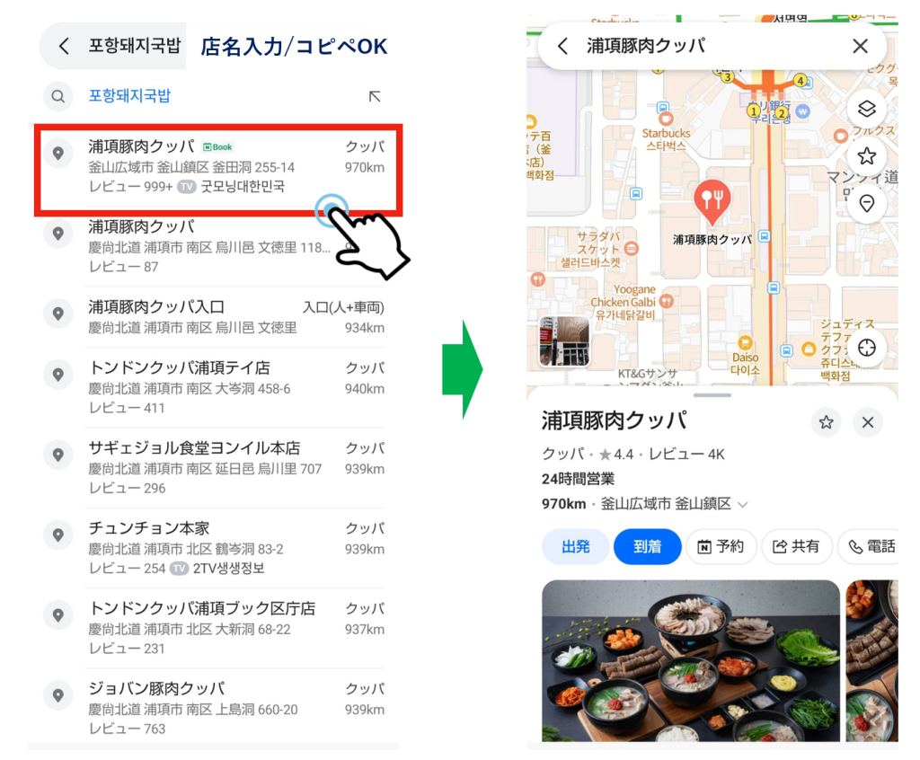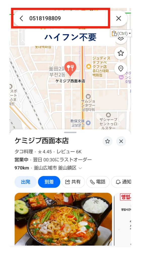 電話番号がわかるとハングル不要で簡単に検索できます。