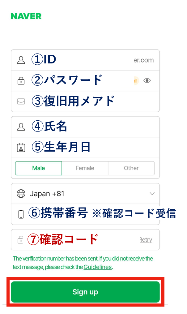 ①~⑥の情報を入力及び受信した⑦確認コードを入力したらSign upをタップする。