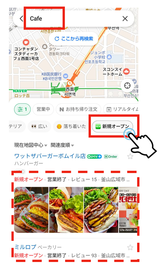 NAVERマップに새로오픈/新規オープンというタグが付き、検索条件としてフィルタリングできるようになりました。