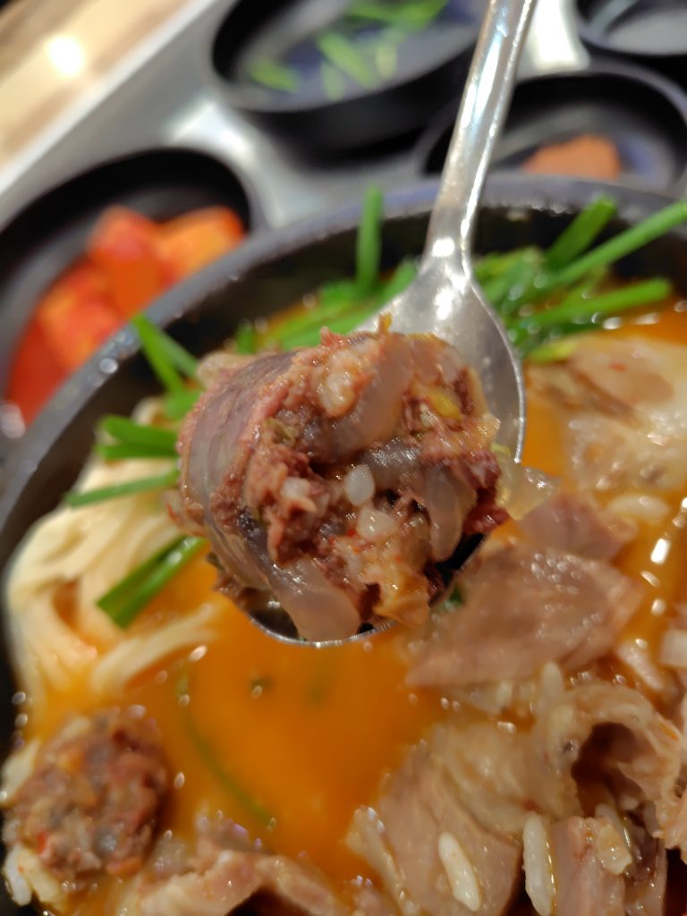 黒いトゥッペギ(뚝배기)の中にはスンデ(순대・腸詰め)・豚肉・素麺・ニラがたっぷり。白濁したスープはクセがなくとても食べやすく、タデギを溶かすとほどよい辛みが加わります。