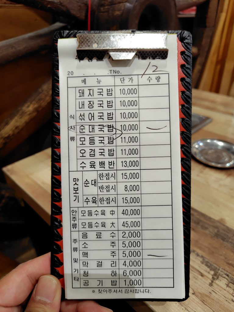 今回注文したのはスンデクッパ(순대국밥)とビール(TERRA)のセットで15,000ウォン